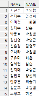 -> name, profno 컬럼의 값이 각각 같은 행을 출력